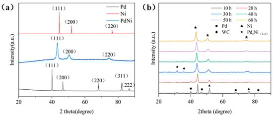 In addition, XRD patterns were conducted on the initial samples and samples at different ball milling process. Figure 9 show the results of XRD patterns. Figure 9a presents the XRD patterns of the initial elemental powders and the alloy sample after 60 h of ball milling. In comparison, it is evident that the peaks of elemental Ni and Pd have almost disappeared after 60 h of ball milling. The three peaks in the alloy XRD pattern correspond to different NiPd alloy phases with the main crystal plane being the (111) plane. The peak height of the alloy phase is relatively low, and the full width at half maxima (FWHM) is relatively wide, showing appreciable changes compared to the sharp and high peaks in the elemental patterns. This indicates that the alloying of the sample has been completed using the HEBM and that the particle size has decreased significantly. Figure 9b shows the XRD patterns of samples at different ball milling times. At 10 h of ball milling, the peaks of elemental Pd and Ni still exist. However, their intensities have been reduced, and the FWHM is broadened compared to the initial state. Simultaneously, new phases have formed. These results indicate that at this stage, the particles for the elementary substances become smaller under the action of impact and friction forces, resulting in a broadening of the FWHM of the elemental peaks. Additionally, new peaks appear with a narrower FWHM, corresponding to particles that have begun to weld and pre-alloy. These changes are consistent with the SEM image analysis presented earlier. As ball milling continues and noted in the pattern at 30 h, all elemental phases have disappeared, indicating that all elementary substances have entered alloying after the squeezing stage. However, the peak positions shift slightly compared to the peaks in final alloy phase, indicating incomplete alloying at this stage. After this stage, as ball milling continues, the changes in the sample patterns are not obvious. On the one hand, the position of the alloy phase continuously shifts to the left, indicating more complete alloying of the sample. On the other hand, there is a slight broadening in the FWHM, corresponding to the particle size changes shown in Figure 3. Additionally, a small amount of WC phase components were detected in the XRD patterns. This is because the vials and grinding balls used in the ball milling process are made of WC, and a small amount of WC had mixed into the sample during the ball milling process.