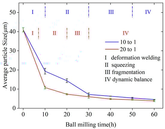 Figure 11 shows the trend in particle size variation over time for two BPRs. Similar to BPR10, the samples of BPR20 also undergo the same changes during the ball milling process: thinning and expansion, axial overlap and thickening, surface roughening followed by smoothing, and eventual rounding. Although the overall ball milling process is similar, there are noticeable differences in the samples at different times and BPRs. By comparing the results of BPR10 and BPR20, it can be seen that they exhibit distinct characteristics. After 10 h of ball milling, the particle size distribution of the BPR10 sample is uneven, with an average particle size of 17.72 µm, and mostly large and thin plate-like structures with relatively smooth surfaces are observed. In contrast, the particle size distribution of the BPR20 is more uniform, with an average particle size of 10.30 µm, approximately 58% of that of BPR10. The surface of the BPR20 particles is relatively rough and has a certain thickness in the radial direction, resembling the particle morphology in the squeezing stage of BPR10. The particles have been transformed into smaller ones under the action of friction and impact, reaching about 168% of the size at the end of the squeezing stage of BPR10, indicating that they have entered the intermediate stage of the squeezing stage. After 20 h of ball milling, the particle size of the BPR20 sample is comparable to that of the BPR10 sample after 30 h of ball milling, and the subsequent reduction in particle size slows down. This indicates that the squeezing stage is completed 10 h earlier when the ball-to-powder ratio is doubled. When the ball milling time is 30 h, the particle size of the BPR20 sample is 5.52 µm. This is comparable to that of the BPR10 sample at a ball milling time of 50 h, which suggests that it has completed the fragmentation stage and entered the dynamic balance stage. The results indicate that BPR20 completes the first three stages of the ball milling process earlier compared with BPR10, significantly improving ball milling efficiency by saving 20 h. After 60 h of ball milling, the average particle size of BPR20 is 3.62 µm, which is 22% lower than that of the BPR10 sample, showing an insignificant reduction. On the other hand, from Figure 10f, it can be seen that compared with the BPR10 samples at the same time, there are individual large particles due to particle aggregation caused by an excessive ball milling time, which should be avoided as much as possible. Finally, when the loading amount is constant during the ball milling process, increasing the ball-to-powder ratio improves efficiency but reduces output production. Factors such as preparation quantity and the aforementioned ball milling parameters should be selected comprehensively in the actual preparation process.