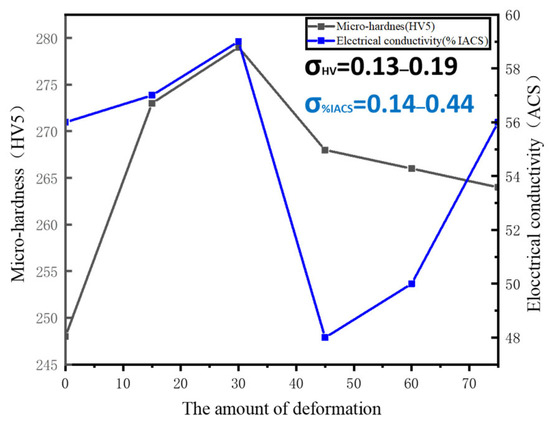 - At 45% deformation, the full development of GP zones in the alloy reduced electrical conductivity. When deformation reached 75%, the presence of γ′ phases with coherent interfaces with the matrix enhanced electrical conductivity while reducing hardness.