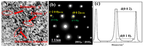 In Equation (1), and represent the inter-planar distances of the precipitated phase and the matrix, respectively; and δ denotes the interfacial mismatch value between the two phases. The bright-field image (a) of the 30% deformed sample in Figure 3 reveals the deformation of the precipitated phase, with a disc-like morphology changing to a curved filament and spherical shape. Figure 3b shows d-spacings d(002)α and d(010)p, which were calculated using microdensitometry trace lines [8] d(002)α = 1.31 nm and d(010)p = 1.16 nm. The degree of mismatch was then determined using the mismatch formula. The degree of mismatch between the precipitated phase Ni-Be and the Cu matrix was 0.12%. At that time, in the direction of the long axis, the interface between the matrix and the second phase was a semi-coherent interface