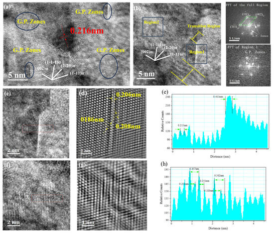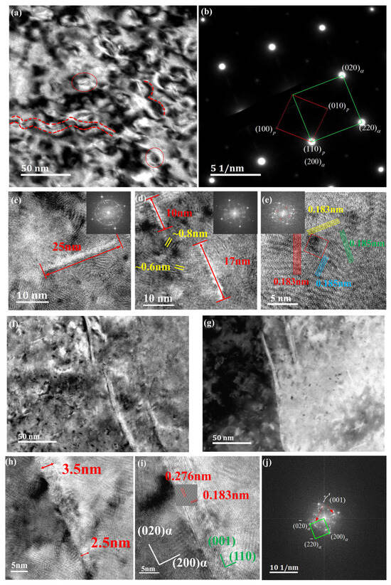The precipitation sequence of Cu-Ni-Be alloys is as follows: α-Cu supersaturated solid solution → (gp) zones → γ″ → γ′ → stable γ (Ni-Be) phase. The GP zones in Cu-Ni-Be alloys consist of a single layer of disk-shaped Be atoms parallel to the {100}αCu matrix. The aging precipitate phase γ″ is alternately formed by Be and Ni atoms, without undergoing a change in habit plane. In previous studies by Zhu Zhiyuan, Cai Yuanfei, et al., the γ″ phase precipitated during aging and exhibited three orientation relationships with the matrix, which can be represented as Variant A: (110)p//(100)α; [110]p//[001]α, Variant B: (110)p//(010)α; [110]p//[001]α, and Variant C: (110)p//(100)α; [001]p//[001]α [9]. This experiment conducted high-resolution characterization on a 30% deformed sample. Combined with panel (a) of Figure 4, FFT was used to locate GP zones, and a γ″ phase consisting of two layers of Be atoms, as shown in Figure 4d, was clearly observed in the GP zone at the top right corner. Its thickness was measured to be 0.411 nm, as shown in Figure 4e. Its long axis was parallel to the (1-1-1)α of the matrix, and its orientation relationship with the matrix can be expressed as: (110)p//(1-1-1)α; [110]gp//[1-1-1]α. Similarly, as mentioned in [10], it is believed that the GP zone first forms a γ″ approximately 10 nm long, consisting of two rows of Be atoms. It is also noteworthy that a GP zone composed of Be atoms appeared in the upper right corner of the GP zone in region 1, with a transition zone of approximately 4 nm. Figure 4f shows that the (1-11)α of the matrix underwent a certain degree of deformation. Figure 4b presents the morphology of GP zones precipitated along the {111} slip planes in different regions. One type is the γ″ phase arranged by two Be atoms within the region (region 1) or a GP zone arranged by a single layer of Be atoms (above region 1), and the other is a short clustered lamellar structure (region 2), both maintaining a fully coherent form with the matrix. In Figure 4e, it can be clearly observed that within the GP zone the overall lattice spacing was relatively uniform, around 0.215 nm. After passing through the γ″ phase composed of two Be atoms, the peak intensity significantly increased, and the overall thickness was 0.411 nm. Figure 4f shows the lattice fringe image of another GP zone morphology, where the lattice spacing was not uniform, but ranged from 0.182 to 0.251 nm, indicating a substantial coherent stress field at this stage. In the bright-field image of a 75% hot-deformed sample, as shown in Figure 5, the second phase grows along the dislocation lines in a curved manner. By analyzing the diffraction patterns in Figure 5b, it was determined that the long axis of the second phase was parallel to the (100)α, (010)α, and (110)α directions of the matrix. In the high-resolution images of Figure 5c–e, the classic three variants can be observed. However, at the end of the second phase in Figure 5d, its precipitation direction is parallel to [110]α. Unlike previous experiments, under a deformation of 75%, second phases with lengths exceeding 100 nm existed, as shown in Figure 5f,g. These were confirmed to be the γ′ phase through high-resolution transmission electron microscopy images and FFT patterns, as shown in Figure 5h–j.