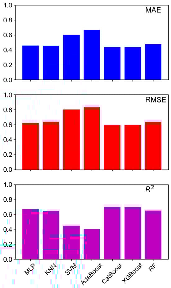 The performance and prediction errors of each model were first evaluated with the mean absolute error (MAE), root mean square error (RMSE), and R-squared (R2) metrics to determine the best models, as shown in Figure 1. These metrics provide valuable insights into the model performance, quantifying the accuracy and error rates of the model predictions. To enhance the robustness of the evaluation, k-fold cross-validation (with k = 5) were employed in the present work as mentioned earlier. Cross-validation divided the dataset into multiple folds, ensuring that each data point was used for both training and validation, reducing bias and variance in performance estimates and helping to mitigate overfitting.