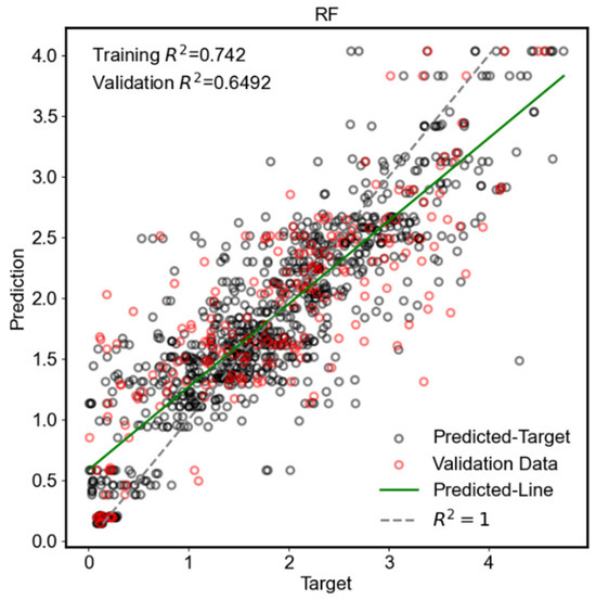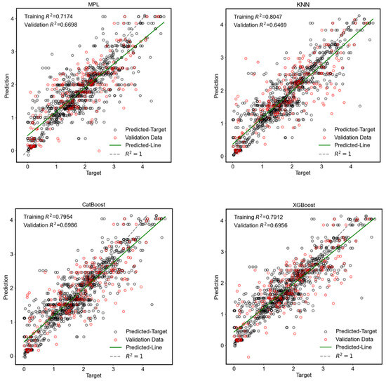 The five models presented similar performance during both the training and validation phases, with training R2 values in the range of 0.7174–0.8047 and validation R2 values in the range of 0.6469–0.6986. The overall R2 values, which include the training and validation data, are 0.7072, 0.7708, 0.7746, 0.7706, and 0.7225 for MLP, kNN, CatBoost, XGBoost, and RF, respectively.