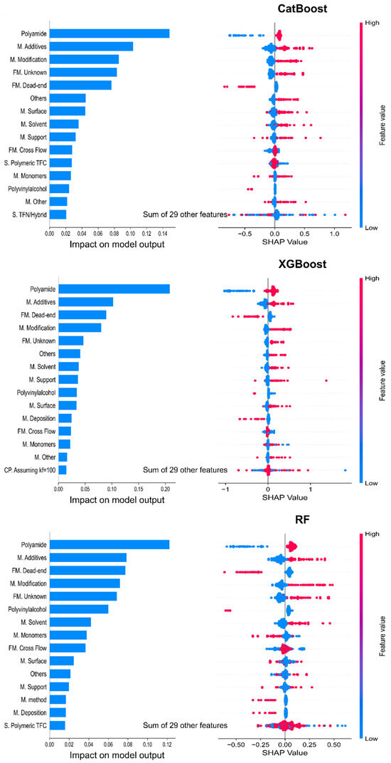 SHAP values determined from CatBoost, XGBoost, and RF for individual membrane features. (M.: Modification, FM. Filtration mode, CP.: Concentration Polarization, S. Structure).