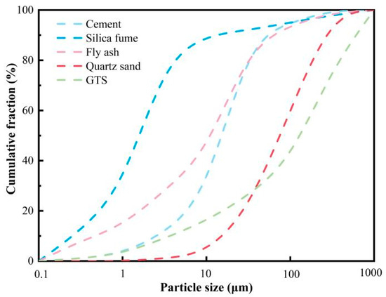 The cementitious components primarily include 52.5 grade ordinary Portland cement with a specific surface area of 358 m2/kg, silica fume, and Class I fly ash. They are all purchased from Henan Jinrun New Materials Co., Ltd. in Zhengzhou City, China. The detailed oxide contents of these materials are presented in Table 1, based on an X-ray fluorescence (PANalytical Axios, Eindhoven, The Netherlands) analysis. Commercially available quartz sand and screened GTS (maximum particle size not exceeding 1.18 mm) were used as fine aggregates. The particle size distribution of all powder particles is illustrated in Figure 1, derived from a laser particle size analysis (Mastersizer 3000, Malvern City, UK). Copper-coated steel fibers with a diameter of 0.22 mm, a length of 13 mm, and a tensile strength of 2865 MPa were adopted for the physical reinforcement of UHPC. All mixtures were modified with a high-efficiency water reducer, containing 26.0% solid content, to regulate workability.