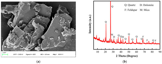 The GTS was sourced from a gold mine in a mountainous region of China, belonging to the flotation tailing sand, and its micro-morphology is shown in Figure 2a. As observed, the particle shapes of GTS are primarily layered, flaky, or angular. The phase analysis shown in Figure 2b, based on X-ray diffraction (X'Pert PRO MPD, Eindhoven, The Netherlands) evidence, indicates that GTS is primarily composed of silicate minerals, with quartz and feldspar as the main components. Table 1 demonstrates the quantitative characterization results of the oxide contents in GTS. The main component of GTS is SiO2 (67.59 wt.%), followed by Al2O3 (9.10 wt.%), CaO (6.16 wt.%), and other elements, which aligns with the basic characteristics of silicate minerals. It is worth noting that the occurrence environment determines that GTS also contains heavy metal elements. The detailed concentrations of Cd, Pb, As, Zn, and Cu are 0.87 mg/kg, 13.5 mg/kg, 224 mg/kg, 173 mg/kg, and 388 mg/kg, respectively.