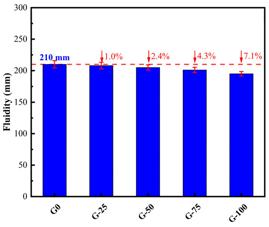 The experimental results illustrating the effect of the GTS replacement ratio for quartz sand on the workability of fresh ECO-UHPC are presented in Figure 3. The measured spread diameters for G0, G-25, G-50, G-75, and G-100 are 210 mm, 208 mm, 205 mm, 201 mm, and 195 mm, respectively. As observed, the fluidity of ECO-UHPC exhibits a slight decreasing trend with an increasing GTS replacement ratio, with a maximum reduction of 7.1%. Based on the phy-chemical characteristics of the aggregates, the potential cause of the workability loss with an increasing GTS content may lie in its slightly higher water requirement (88.93%) compared to quartz sand (82.45%). In addition, the flaky morphology of GTS particles exacerbates inter-particle frictional resistance in the context of the low water-to-binder ratio of ECO-UHPC, thereby hindering the free flow of the mixture.
