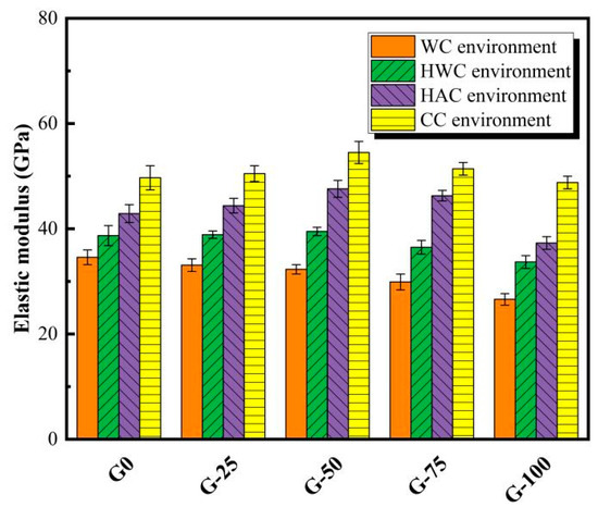Figure 5 demonstrates the variation in the elastic modulus of ECO-UHPC containing different GTS substitution rates under four curing experiences. In this study, the elastic modulus of the fully developed (28-day) matrix is used as a representative result. As presented in Figure 5, the static elastic modulus of the WC-cured ECO-UHPC decreases significantly with the increasing GTS content, which is consistent with the previously observed trend in cubic strength changes. The morphology of GTS particles is characterized by multi-layered composite plates with a lower stiffness (due to the low quartz content and softer minerals), which deform more than quartz sand under compressive stress, thus reducing the modulus values of ECO-UHPC [23]. The elastic modulus of 20 °C water-cured UHPC with GTS substitution rates of 25%, 50%, 75%, and 100% (i.e., G-25/50/75/100) are 33.1 GPa, 32.3 GPa, 29.9 GPa, and 26.6 GPa, respectively, which represent reductions of 4.3%, 6.6%, 13.6%, and 23.1% compared to G0. These changes are slightly larger than the previously observed variations in cubic strength. As for the thermally cured ECO-UHPC specimens, the elastic modulus increases and then decreases with the increasing GTS content, exhibiting a trend that is in good agreement with the evolution of cubic strength. Notably, the specimen G-50 achieves the highest elastic modulus in the HWC, HAC, and CC environments, with values of 39.5 GPa, 47.6 GPa, and 54.5 GPa, respectively. Among these, the combined curing regime induces the optimal modulus values. In contrast, the elastic modulus of G-50 after curing in the CC environment is 68.7% higher than that in the ambient temperature environment. This suggests that the densification of the hardened gel compensates for the matrix defects, and the angular GTS particles, to some extent, limit the relative displacement between the aggregates (GTS or quartz sand) and the cementitious substances, thereby enhancing the deformation resistance of ECO-UHPC [23].