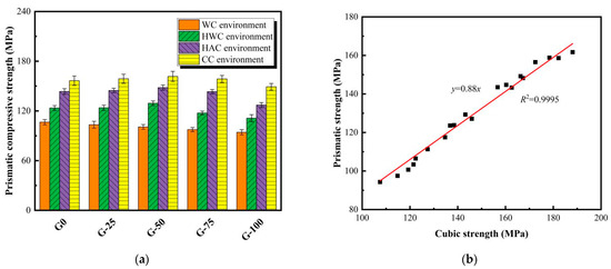 Figure 6 illustrates the variation in the prismatic strength of ECO-UHPC containing different GTS replacement rates under four curing experiences. In this study, the prismatic strength of the fully developed (28-day) matrix is used as a representative result. As depicted in Figure 6a, the prismatic strengths of G-25/50/75/100 cured in water at 20 °C are 103.4 MPa, 100.7 MPa, 97.5 MPa, and 94.3 MPa, respectively, representing reductions of 2.9%, 5.4%, 8.5%, and 11.5% compared to G0. This indicates that replacing quartz sand with GTS under ambient curing conditions leads to a decrease in the prismatic strength of ECO-UHPC. Similar to cubic strength, different results are observed in ECO-UHPC after a thermal curing treatment. Taking the CC environment, which exhibits the best enhancement effect, as an example, the prismatic strengths of G-25, G-50, G-75, and G-100 are 158.8 MPa, 161.7 MPa, 158.6 MPa, and 149.2 MPa, respectively, with changes of +1.5%, +3.3%, +1.3%, and −4.7% compared to G0. It is clear that ECO-UHPC incorporated with GTS can reach or even exceed the mechanical strength of G0 with an appropriate initial curing treatment. This is because thermal curing compensates for the weak bonding between GTS and the cementitious substances, thereby improving the tolerance of the UHPC matrix to substitute aggregates. As shown in Figure 6b, the ratio of prismatic to cubic strength for ECO-UHPC at 28 days is 0.88, indicating a certain size effect.