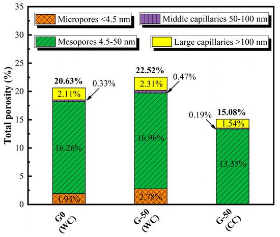 The pore characteristics of G0 and G-50 when experiencing the WC environment, as well as G-50 when experiencing the CC environment, are shown in Figure 8. To better distinguish the porosity characteristics of ECO-UHPC under different GTS replacement rates and early curing experiences, the pore sizes are classified into four ranges: micropores (<4.5 nm), mesopores (4.5–50 nm), middle capillaries (50–100 nm), and large capillaries (>100 nm) [40]. As demonstrated in Figure 8, the total porosity of G0 (WC), G-50 (WC), and G-50 (CC) are 20.63%, 22.52%, and 15.08%, respectively. Increasing the GTS substitution rate results in a slightly higher total porosity of the ECO-UHPC than the pure quartz sand-based UHPC in the 20 °C water curing environment. Moreover, the main pore deterioration detected is due to the increase in micropores with a size smaller than 4.5 nm. This implies that the bonding performance of waste GTS with the hardened paste is weaker than that of quartz sand. A comparative observation of the pore structure of G-50 (WC) and G-50 (CC) reveals that thermal curing significantly reduces the total porosity of ECO-UHPC, with a comprehensive refinement of all types of pores. Specifically, the porosity of the micropores, mesopores, middle capillaries, and large capillaries decreases from 2.78%, 16.96%, 0.47%, and 2.31% in the G-50 (WC) sample to 0%, 13.35%, 0.19%, and 1.54% in the G-50 (CC) sample, respectively. It should be noted that the “autoclave reaction” created by the combined curing method optimizes the densification process of the binder phase, thereby repairing the weak bonding between the waste GTS and hardened paste. This improves the mechanical strength of ECO-UHPC and enhances its ability to dispose of waste GTS [28,29].