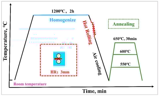 The composition of the TWIP steel used in the experimental methods is Fe-25Mn-1Al-3Si-0.2C (wt.%). This was melted in a 50 kg vacuum induction furnace and then cast into a mold with dimensions of Ø170 × 350 mm. After homogenizing at 1200 °C for 2 h in an Ar atmosphere, the ingot was hot-rolled into 3 mm plates in 7 passes along the axial direction, with initial and final forging temperatures of 1150 °C and 900 °C, respectively. Large deformations were applied during the hot-rolling process to induce high dislocation densities and fine grains. After hot rolling, the specimens were cut from the rolled plate and then subjected to a modulated annealing treatment in an Ar atmosphere at 550 °C, 600 °C, and 650 °C for 30 min, respectively. The test samples were designated as HR (hot-rolled state), AN550, AN600, and AN650. The process flow diagram is shown in Figure 1.