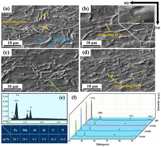 Figure 2 shows the microstructures of samples under various conditions. In the hot-rolled sample, a large number of annealing twins and slip bands were observed in austenite grains (Figure 2a). However, no significant precipitates were observed (Figure 2a). Figure 2b–d show the microstructures of samples AN550, AN600, and AN650, respectively. For all annealed samples, the annealing twins and precipitates are present within austenite grains and along grain boundaries, respectively. In contrast, the precipitate size in sample AN550 was much smaller than in other samples. As shown in the enlarged image in Figure 2b, numerous fine precipitates were intra-granular in addition to the grain boundaries (GBs). For samples AN600 and AN650, the increase in annealing temperature inevitably induced the coarsening of precipitates (green ellipses), especially the particles in grain boundaries. Figure 2e shows the EDS result of the precipitate in sample AN600. Its chemical composition was 38.7Fe-18Mn-16.3C (at%), implying that similar precipitates included (Fe, Mn)3C cementite particles. Figure 2f displays the XRD results of samples before and after annealing. It can be seen that only single γ-Fe diffraction peaks were exhibited, indicating a fully austenitic single phase without any phase transformation.