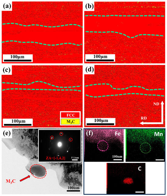 EBSD and TEM were performed to analyze the microstructures (Figure 3). Banded structures (dashed lines) and precipitates (M3C) were present within the austenitic matrix. These banded structures were formed due to the uneven distribution of Mn, which also affected recrystallization behavior [13]. For the hot-rolled sample, a small number of fine precipitates were detected (Figure 3a). In contrast, there were many more nano-scale particles exhibited in AN550 samples (Figure 3b). TEM-EDS mapping (Figure 3f) clearly showed that Fe, Mn, and C were enriched in the precipitates. The corresponding selected area diffraction pattern (SADP) verified these nano-scale particles were (Fe, Mn)3C cementite (Figure 3e). As the annealing temperature increased, the fine precipitates within grains gradually dissolved, while the precipitates distributed along GBs gradually coarsened (Figure 3c,d).