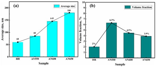 where G is the shear modulus (72.0 GPa); b is the Burgers vector (0.254 nm); and f and x represent the volume fraction and average size of precipitate, respectively (Table 1). The measured σp values of samples AN550, AN600, and AN650 are 147, 83, and 66 MPa, respectively.