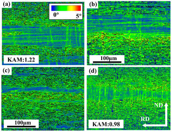 Figure 5a–d show the kernel average misorientation (KAM) maps and the corresponding KAM values of all samples. The KAM value can reflect the geometric dislocation density and recrystallization volume fraction of the sample [13,14,15,16]. The KAM value decreased from 1.22 to 0.98 with the increased annealing temperature. It can be seen that the recrystallized volume fraction and the dislocation density increase and decrease with the increase in annealing temperature, respectively.