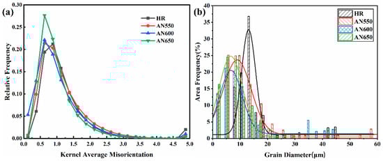 The specific KAM values calculated are shown in Figure 6a. Figure 6b shows the statistical distribution of grain sizes for all samples, which were fitted with a normal distribution function and are summarized in Table 1. It can be seen that the grain size decreases with the increase in annealing temperature.