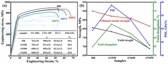 Figure 7a,b show the engineering stress–strain curve and the measured mechanical properties of all samples. As the annealing temperature increased, the yield strength (YS) and ultimate tensile strength (UTS) gradually decreased. Then, the total elongation (TE) and UTS × TE (PSE) showed a trend of first increasing and then decreasing. The largest elongation of 54.9% and the highest PSE of 58.9 GPa% were obtained for sample AN550.