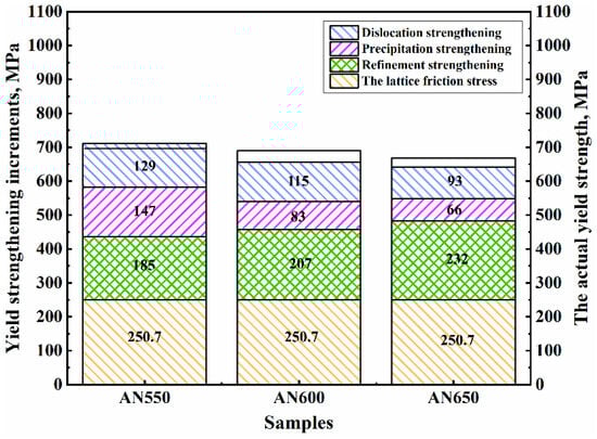 where ky is constant, with a value of ~683.07 MPa µm1/2 [5], and di represents the average grain size. The calculated σg values for samples AN550, AN600, and AN650 are 185, 207, and 232 MPa, respectively.