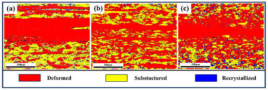 Recrystallized distribution maps of samples AN550 (a), AN600 (b), and AN650 (c), respectively. The red, yellow, and blue colors represented the deformed, partially recrystallized, and fully recrystallized grains, respectively.
