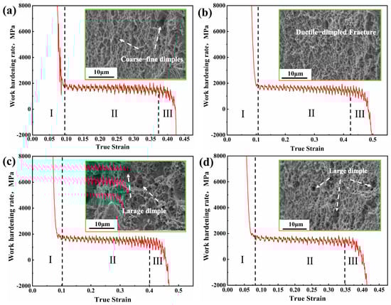 The strain-hardening behavior was closely related to the deformation mechanism. Figure 10 shows the work-hardening rate-true strain curves and the corresponding fracture morphologies of all samples. All curves can be divided into three stages (I, II, and III). At stage I, the work hardening rate decreased rapidly due to the dynamic recovery of dislocations [14]. Then, the work hardening rates gradually reached constant values with the increasing true strain (stage II). Finally, the work-hardening rate significantly decreased until fracturing (stage III). The fracture morphologies of samples are shown in the top right corner of Figure 10a–d. All samples showed a large number of dimples. In contrast, the dimples were fine and evenly distributed in sample AN550 (Figure 10b), leading to the typical features of ductile fractures [14,29].