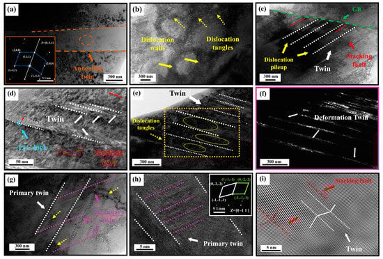 As the strain increases to 0.3, more dislocations are activated. A number of dislocations accumulate at the GBs, so that the stress reaches the critical stress required for the formation of twinning, thus promoting the generation of twins. In addition, the presence of a large number of dislocations moving near the stacking faults contributes to the formation of deformation twins [31]. Therefore, with the increase in strain, a large number of primary deformation twins are formed, causing continuous work hardening. Simultaneously, the interaction between stacking fault and deformation twin promotes the formation of the Lomer–Cottrell lock (Figure 11d), thus hindering the dislocation movement and enhancing the WHR [12,31]. In addition, the twin boundaries hinder dislocation motion, causing dislocation tangles. Further movement of the dislocation results in the formation of dislocation substructures between the twin lamellae (Figure 11e,f). However, the dislocation substructures can further impede dislocation movement, which promotes work hardening [23]. As strain increases, the formation of secondary twins can hinder dislocations from crossing the grain boundary barrier and avoid their annihilation, thus increasing dislocation density. Meanwhile, numerous deformation twins play a crucial role in grain refinement through the dynamic Hall–Petch effect (Figure 11g–i), thereby reducing the average free path of dislocations and further enhancing the WHR [1,32].