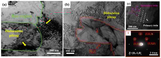 At a true strain of 0.15, a number of dislocations were activated. The interaction between dislocations gradually forms dislocation tangles and several dislocation substructures, such as dislocation cells, as shown in Figure 11b. Simultaneously, a large number of dislocations accumulate at the GBs, due to the blocking effect of GBs, resulting in stress concentrations. In order to achieve release stress, grain boundaries become a source of dislocation radiation, resulting in rapid dislocation proliferation [30]. It was reported that the dissociation of pre-dislocation from partial dislocation can provide nucleation points for deformation twins and promote the formation of stratification faults [31]. Shockley partial dislocations were emitted to further promote the formation of stacking faults and twins at the GBs, enhancing WHR [30], as shown in Figure 11c.