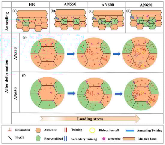 Microstructural evolution diagrams of different samples after annealing (a–d), and after deformation for AN550 and AN650 samples (e,f). (a) HR; (b,e) AN550; (c) AN600; (d,f) AN650.