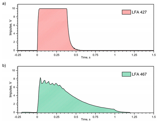 Despite the use of the same heat transfer model in the measuring specimen and the same method for determining the thermal diffusivity of the tested steels in both devices, i.e., LFA427 and LFA467, the obtained thermal characteristics of thermal diffusivity differ slightly, i.e., they do not overlap in the range from RT to approx. 500 °C. This is probably related to the impossible assumption of the heat transfer model in the specimen, which assumes that the front surface of the specimen is heated by a Dirac pulse at time t = 0 [17,19,20]. In the case of a high-temperature device, the adopted model of heat transfer in the specimen is closer to reality, because the laser pulse is, for example, 0.6 ms wide, i.e., it is short and has a shape close to a rectangle (Figure 1a). In the case of a low-temperature device, the pulse is obtained from a xenon lamp, but the shape of the pulse significantly differs from the Dirac pulse, and additionally the pulse is wide and extended in time, for example 1.2 ms (Figure 1b). It therefore seems that the results of the thermal diffusivity measurement of steel obtained using the LFA 427 device are more reliable, i.e., they are burdened with a smaller error compared to the results obtained using the LFA 467 device. The thermal diffusivity measurements of the tested steels were performed using both devices, i.e., LFA 427 and LFA 467 with the NETZSCH Proteus v.8.0.2 software and the Cape–Lehman plus pulse correction heat transfer model in the specimen, which takes into account the pulse width [22,23,24,25]. According to NETZSCH, the accuracy of the thermal diffusivity determination in both devices is the same and is +/− 3% [16]. According to the authors of this paper, in the case of a pulse extended in time, the results of thermal diffusivity calculations will be overestimated [26,27,28].