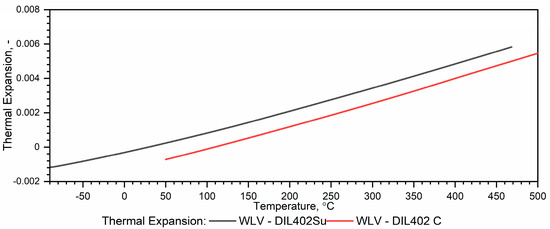 In contrast to the thermal diffusivity measurements, the thermal expansion characteristics obtained with the DIL 402 Expedis (DIL 402 Su) generally agree with the results of measurements taken with the DIL 402 C in the temperature range from RT to 500 °C [26,27]. Therefore, calculations can be performed over a wide temperature range, i.e., from (−)50 °C to 1100 °C, without additional procedures related to combining both characteristics. A problem occurs when the specimen has shrunk during the first run and the calculations are performed for the second heating run—Figure 2.