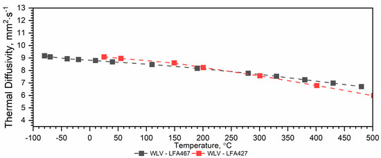 The results of the thermal diffusivity measurements of WLV steel as a function of temperature a(T) in the temperature range from (−)50 °C to approximately 500 °C, performed using LFA 467, were compared with the results of such measurements carried out using LFA 427 in the same temperature range—Figure 4. The maximum relative error ∆a/a between the results from LFA 467 and LFA 427 related to the thermal diffusivity value from LFA 467 occurs at 500 °C and is 7%. Below 500 °C, i.e., in the range from RT to approximately 500 °C, the results from both devices are within 3%.