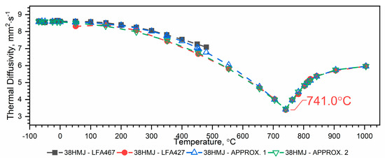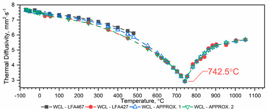 The results of the thermal diffusivity measurements a(T) of WLV, 38HMJ and WCL steels in the temperature range from (−)50 °C to about 1100 °C obtained using LFA 467 and LFA 427 devices are shown in Figure 5, Figure 6 and Figure 7. The combination of thermal diffusivity characteristics of WLV, 38HMJ and WCL steels obtained from both devices, i.e., low-temperature LFA 467 and high-temperature LFA 427, with thermal diffusivity characteristics in the full temperature range, i.e., from (−)50 °C to 1100 °C, can be achieved through two ways, i.e.: