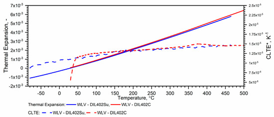 Example measurement results and CLTE* with DIL 402 Expedis and DIL 402 C ((−)50 °C–500 °C—own results, RT—1100 °C—based on [7,29]).