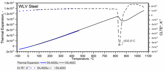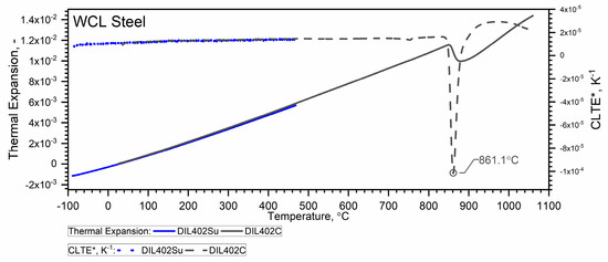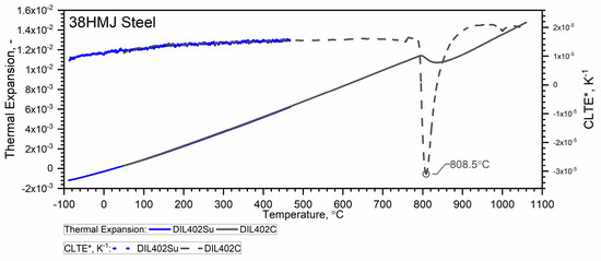 The thermal expansion characteristics of the tested steels, i.e., WLV, 38HMJ and WCL—Figure 9, Figure 10 and Figure 11, show that at a temperature of about 835.8 °C for WLV steel, 808.4 °C for 38HMJ steel and 760.9 °C for WCL steel, a ferrite–austenite phase transition occurs—the so-called shrinkage effect. This was discussed in the authors’ work [7,26,27,29]. This paper describes the procedures used to relate the thermal expansion characteristics obtained at low temperatures to those obtained at high temperatures.