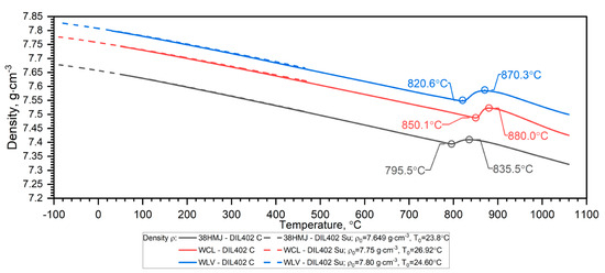 Density of WLV, 38HMJ and WCL steels in the temperature range from (−)50 °C to 1100 °C.