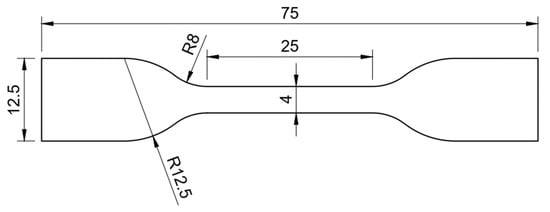 The bulk test provides the tensile properties of the film adhesive, determining the Young’s modulus and tensile strength. The stress–strain curve provides the elastic and plastic behaviour of the material [11]. Six bulk dumbbell specimens (also known as dogbone) for LS were manufactured according to the DIN 53504 standard [15,16]. The specimens used to describe the tensile behaviour of the film adhesive are schematically represented in Figure 1. Due to the fact that the material was provided in sheets with a predetermined thickness, the thickness deviated from the standard and corresponded to 0.1 mm.