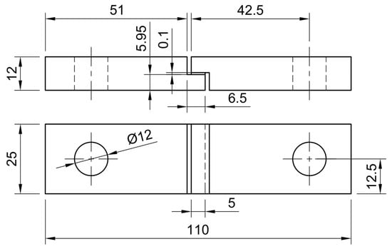 TAST aluminium specimens were manufactured and precisely rectified to ensure an adhesive thickness corresponding to the thickness of the HMA film, according to the ISO 11003-2 standard [18]. Figure 2 illustrates the dimensions of the specimens with a minor modification from standard measures. The height of the bonding section was increased from 5.75 mm to 5.95 mm to ensure that the final thickness exactly matched the HMA film thickness. This slight adjustment allows for a more accurate representation of the adhesive’s performance under shear conditions while maintaining overall compliance with the standardised testing method, avoiding the need for layer stacking. At least three TAST specimens were tested to ensure consistent shear values [19].