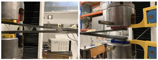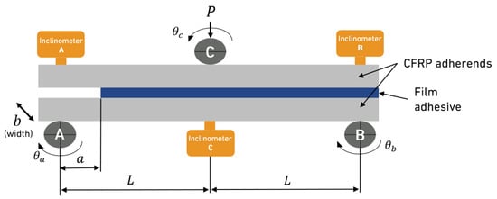 The ENF test was performed using DCB specimens without loading blocks. Three of the aforementioned inclinometers were positioned as shown in Figure 5, according to the loading points. The initial crack length (a) was 50 mm and L was 140 mm. The test was performed at a constant crosshead speed of 0.5 mm/min.