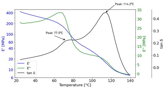 The glass transition temperature was determined using DMA conducted with a Netzsch DMA 242 E Artemis (Erich Netzsch GmbH & Co. Holding KG, Selb, Germany) testing machine. A rectangular sample with dimensions of 12 by 6 by 0.1 mm was prepared for testing in tensile deformation mode. The analysis was carried out at a frequency of 1 Hz with a constant displacement amplitude of 40 µm, in a temperature range of 24 °C to 140 °C with a heating rate of 2 °C/min.