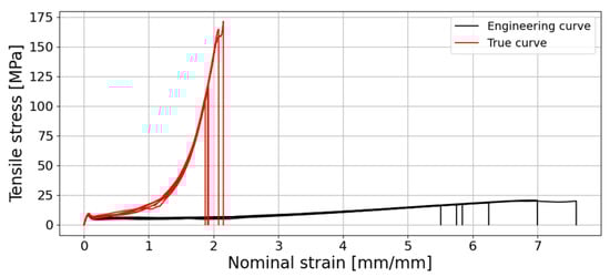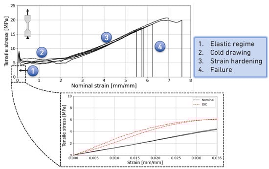 The elastic properties outputted provided a Young’s modulus (E) of MPa, a yield strength () of MPa, tensile strength () of MPa and an elongation () of %. There are dissimilarities regarding the output values of Young’s moduli between tensile tests in plastic materials standards (ASTM D638 [31], ASTM D412 [32] and ISO 527-1 [33]); nonetheless, it can be considered as the slope value from a straight line starting in zero up to a point where it no longer overlaps with the stress–strain curve. In fact, Figure 7 shows two graphs, one being the stress versus nominal strain curve and the other the stress–strain zoom-in of the elastic regime.
