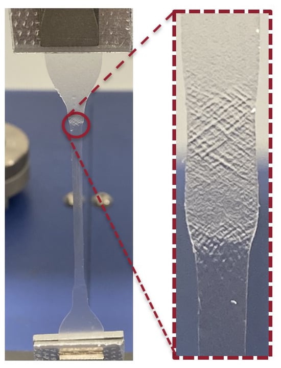 The hot-melt film sheets had to be cut and trimmed with precision to follow the standard dimensions. To do this, a computer-aided design (CAD) model was made and a 3D-printed polylactide (PLA) part served as an exact cutting guide when cutting out the bulk specimens [17]. Thereafter, the 3D-printed part was pressed against the film protector paper layer and the film cut with a medical 10 mm scalpel. After the desired geometry was achieved, aluminium tabs were added to the ends of the specimens using a pressure sensitive adhesive (PSA), given the non-tackiness of the hot-melt film. This procedure was necessary to secure the specimens to the gripping system of the testing machine.