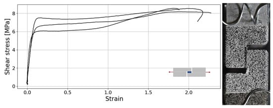 The TAST was able to output the adhesive shear properties. The shear strain depicted in the shear stress–strain curve, as illustrated in Figure 10, was derived from a linear extensometer. The use of displacement linear variable differential transformer (LVDT) yielded more reliable measurements throughout the tests, exhibiting a lower signal-to-noise ratio compared to DIC. The improved reliability stems from the method’s ability to detect minute relative movements between adherents, which is particularly advantageous when dealing with very thin adhesive layers. Assuming a Poisson ratio of 0.4, the shear modulus (G) is 90 MPa, the shear strength () MPa and the maximum shear strain () is %. The three specimens tested showed adhesive failure.