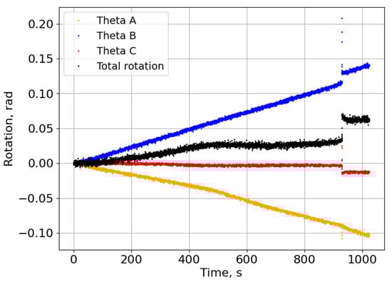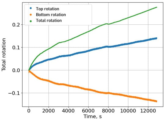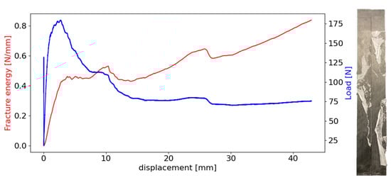 Figure 14 shows the rotations measured in one of the tested specimens. The propagation of the crack was sudden, similar to that of brittle adhesives [27]. This behaviour is evident in two key observations: the rapid change in rotations and the precipitous drop in the load–displacement curve, clearly illustrated in Figure 15. This figure also shows the relationship between fracture energy and displacement, highlighting the presence of a plateau immediately after the drop in the load–displacement curve. This plateau indicates a stabilisation in fracture energy, suggesting a consistent energy absorption phase after initial crack propagation. An average value of N/mm was found to be the critical energy release rate of the film adhesive under pure Mode II loading. This value corresponds to the three best ENF specimens tested.