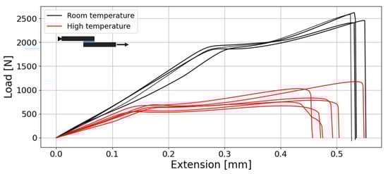 Lap shear curves for aluminium SLJs tested at room and high (80 °C) temperature.
