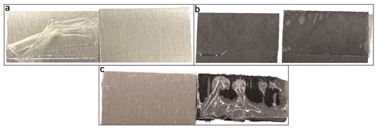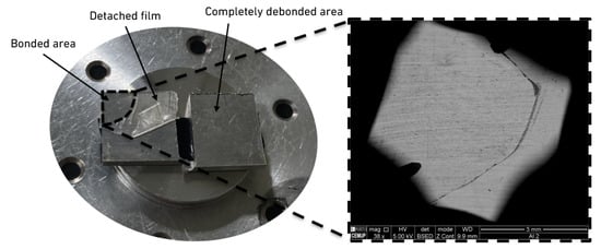 The failure of the lap shear and DCB tests was similar, showing that both adhesive failures (AFs) are visible to the naked eye. To ensure this, aluminium adherents from SLJ tests were analysed in SEM [36,37,38]. Figure 19 shows the surface of samples from one tested lap shear specimen with some film still attached and the SEM backscattered electron detector (BSED) image of the corresponding surfaces.