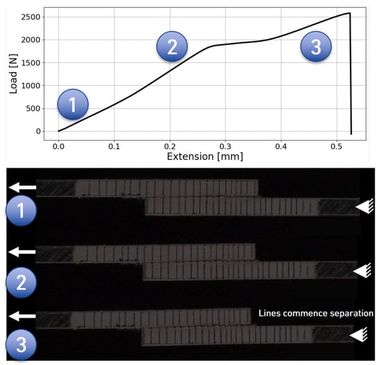 During testing, the hot-melt film detached interfacially from both substrates, leading to an irregular, non-linear crack front and propagation. This detachment ahead of the crack front introduced challenges in accurately measuring the critical energy release rate, an issue that has not been widely reported in fracture energy measurements for interfacial delamination specimens [35]. In addition, a stretching phenomenon was observed in all specimens tested, as illustrated in Figure 11. This provided incorrect measurements of the interfacial value of , since the Mode I DCB test propagated the crack by the detached interface along with the tension load of the unattached adhesive film.