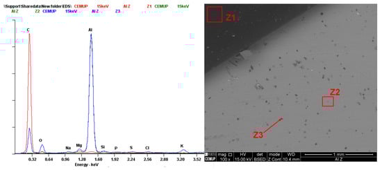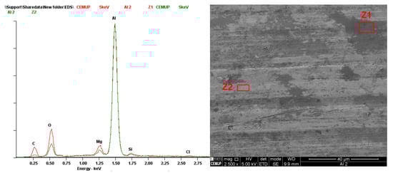 To validate this assumption, the bonded adhesive film was then hand-peeled and the aluminium surface was immediately analysed, ensuring that no contamination occurred. The results are shown in Figure 21, highlighting dark grey (Z1) and light grey (Z2) areas. Both show a similar spectrum, with the darker area having a greater quantity of C and O, hypothetically due to aluminium oxidation or corrosion. However, they are not similar enough to the adhesive spectrum and guarantee a cohesive failure (CF) of the joint.
