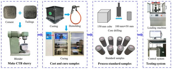 - Make CTB slurry: The tailings were placed in an oven for drying to remove the moisture. The tailings and cement were weighed in sequence following the designed maximum ratios aforementioned and mixed evenly in a blender. To ensure that the slurry was uniformly mixed, the mixture was stirred for at least 3 min after quantified water was added.
