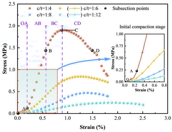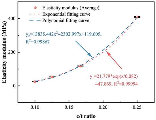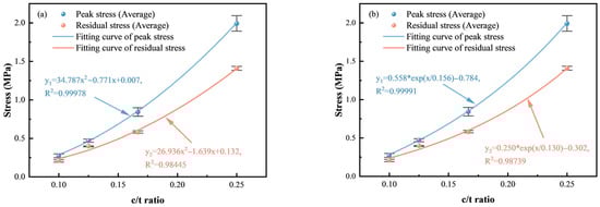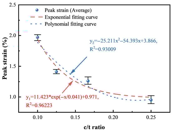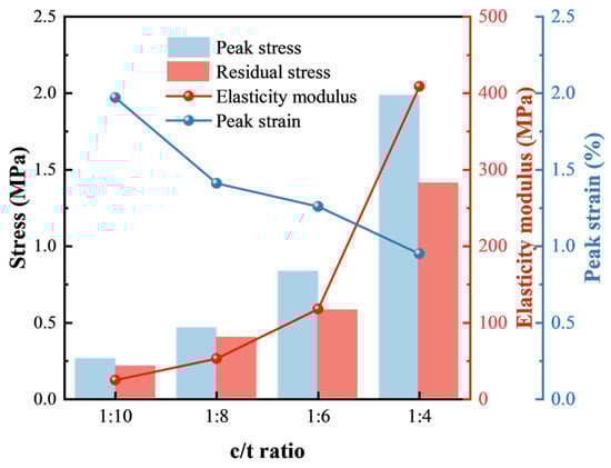 - The effects of c/t ratio on the mechanical properties of CTB follow exponential functions, exhibiting higher R2 values compared to polynomial functions. The peak stress, the residual stress, and the elasticity modulus of CTB decrease, while the peak strain increases with the decreasing c/t ratio.
