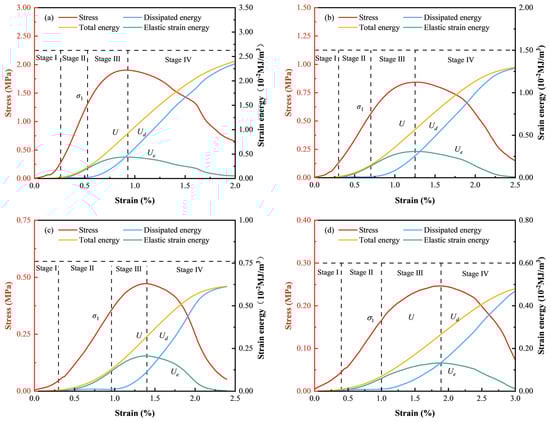 - The energy evolution of CTB with different c/t ratios follows similar trends, progressing through the stages of initial compaction, elastic, plastic, and failure. The elastic strain energy increases slowly at first, then dramatically, and finally decreases gradually with axial strain increasing, and the dissipated energy increases in a “gentle–rapid–steady–slow” pattern.