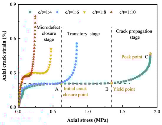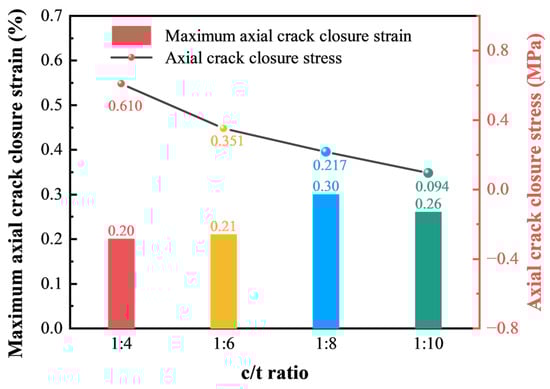 - Macroscopically, CTB with different c/t ratios presents diverse failure modes. As the c/t ratio increases, the failure mode transforms from line-shaped tensile failure to combined tension–shear failure and diagonal shear failure. Microscopically, the total microcrack number and shear microcrack number increase consequently, whereas the tension microcrack number decreases with increasing c/t ratios.
